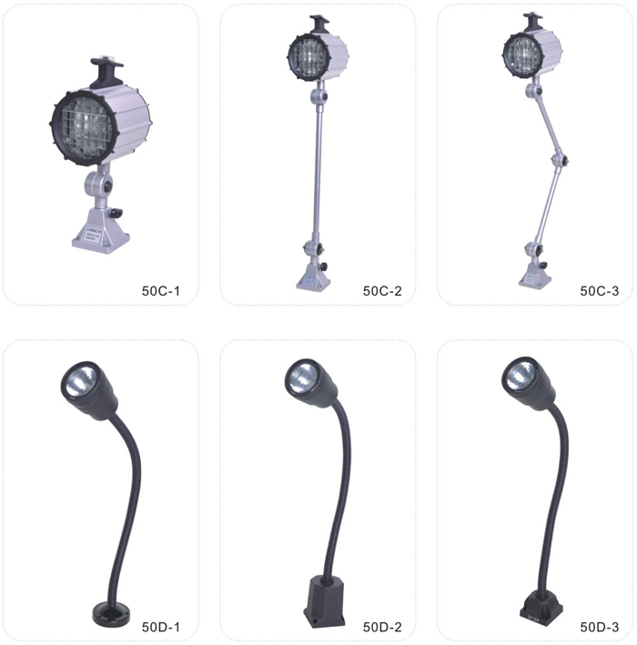 JS.109003 50C、50D系列工作燈 50C工作燈采用新光源鹵鎢燈泡,光線柔和,聚光性好,適用于各種大中型機(jī)床,數(shù)控機(jī)床,加工中心及普通機(jī)床的照明,并具有防水、防爆、防侵蝕等優(yōu)點(diǎn)。 50D適用于中小型機(jī)床,醫(yī)療設(shè)備及汽車修理、船舶檢修、設(shè)備維修的工作照明?蓛(nèi)裝電子變壓器,輸入不同電壓。